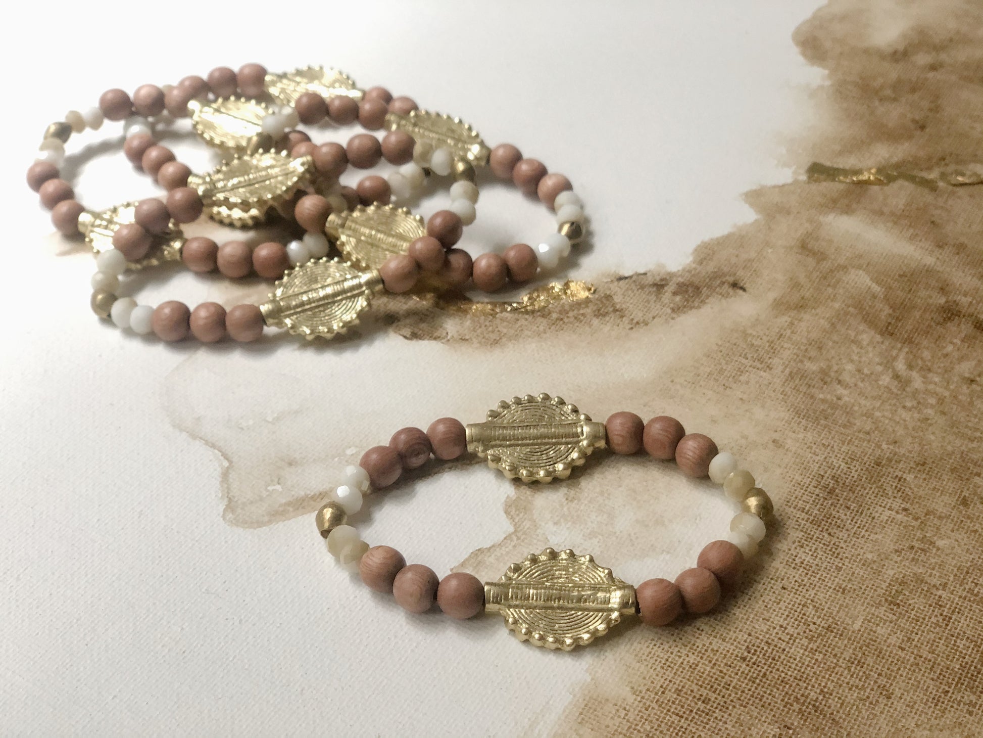 This bracelet *screams* of long, warm summer days Warm, neutral sand tones from the natural rosewood beads perfectly compliment the sparking cream crystal beads with two signature brass sun beads that add the perfect amount of extra Wear this alone or in a big, fun, summer stack of bracelets and you’ll have a golden summer anytime, anywhere.