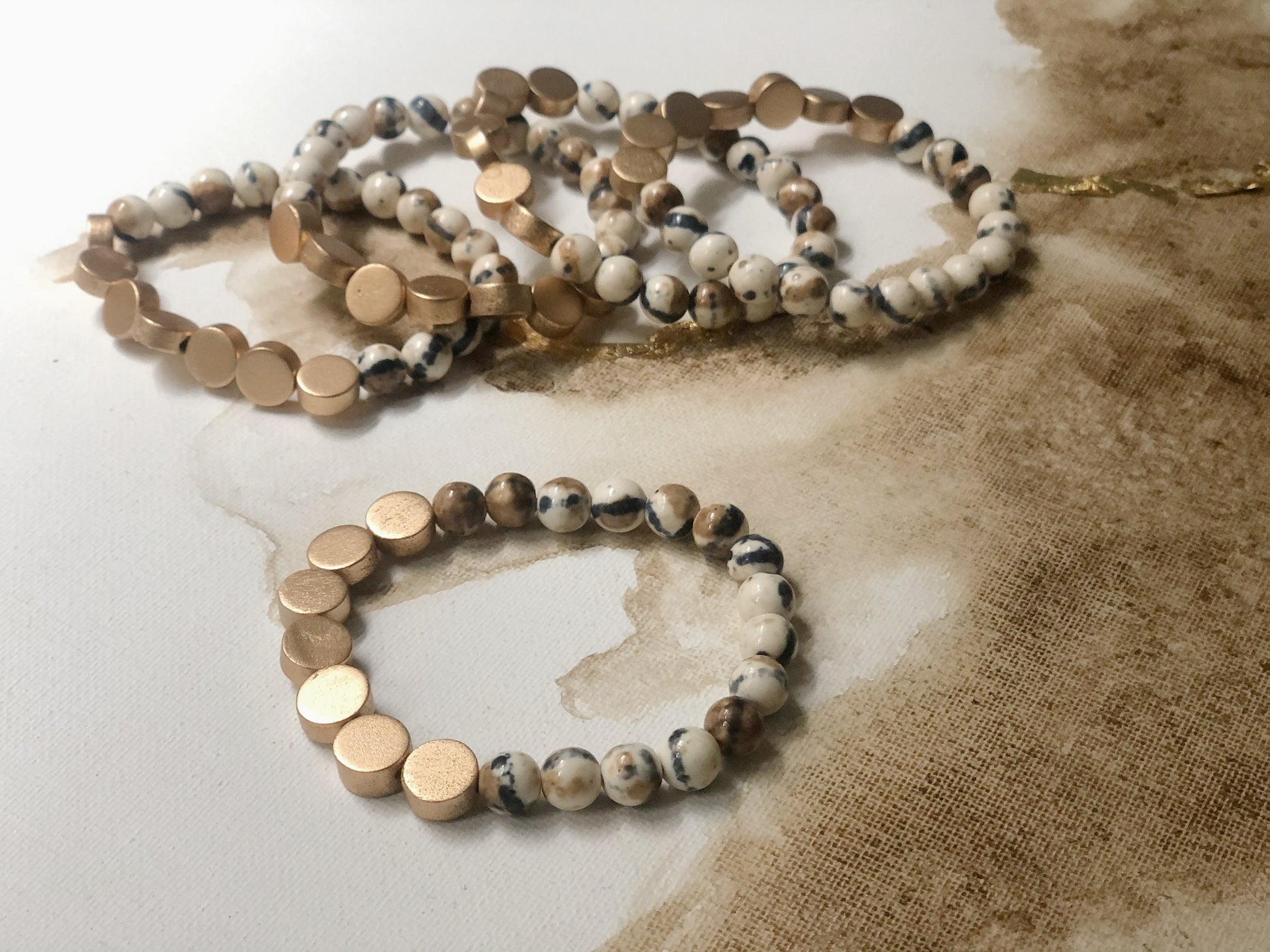Rainflower Stone is a unique agate that has swirls of beautifully dark inky navy & taupey mustard on a cream backdrop, making it the perfect accompaniment to every outfit for Spring and many seasons to come. Gold bamboo beads are a perfect diffuser for your favorite essential oils. Worn alone or in a bracelet stack, this bracelet is a stand out piece.
