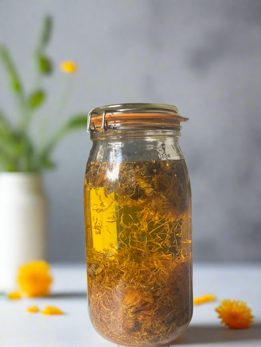Calendula infused Apricot & Almond Oils gently and naturally exfoliate & fights redness, inflammation, & signs of aging.